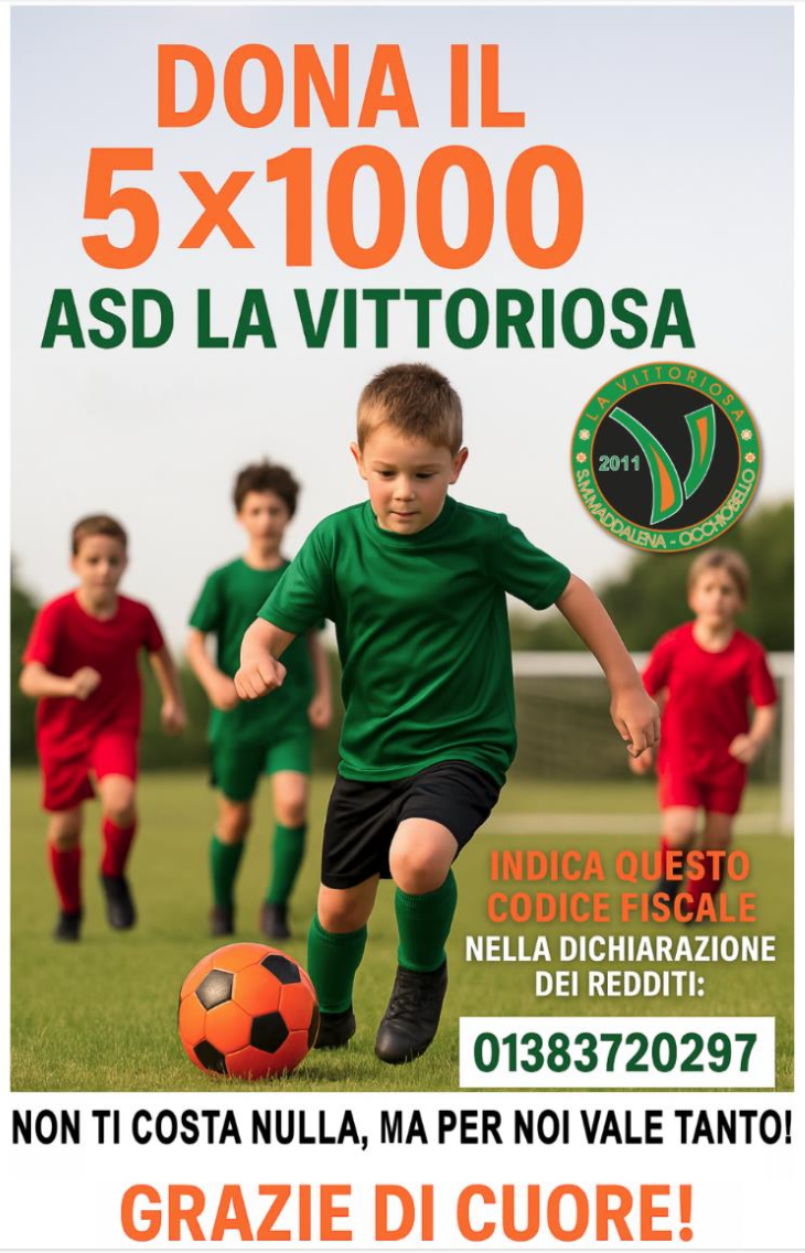 La Vittoriosa è una di queste realtà. Una società sportiva che da anni promuove lo sport come luogo di crescita, inclusione e socialità. Quest’anno, più che mai, il tuo 5×1000 può diventare un tassello fondamentale per migliorare i nostri spazi e renderli ancora più accoglienti, sicuri e accessibili per tutti.